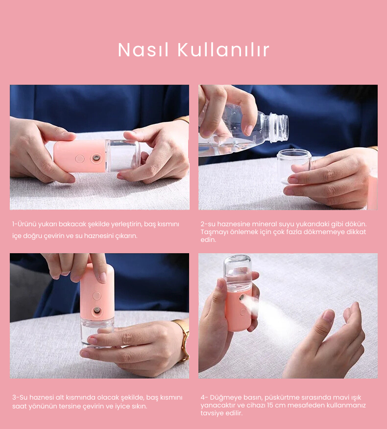 Mini taşınabilir yüz buhar makinesi, suyu nano partiküllere ayırarak cildinize ince bir sprey şeklinde püskürtür. Cihazın içinde bulunan nano teknoloji, suyu hızlı bir şekilde buhara dönüştürür ve buharın cilt tarafından daha kolay emilmesini sağlar.